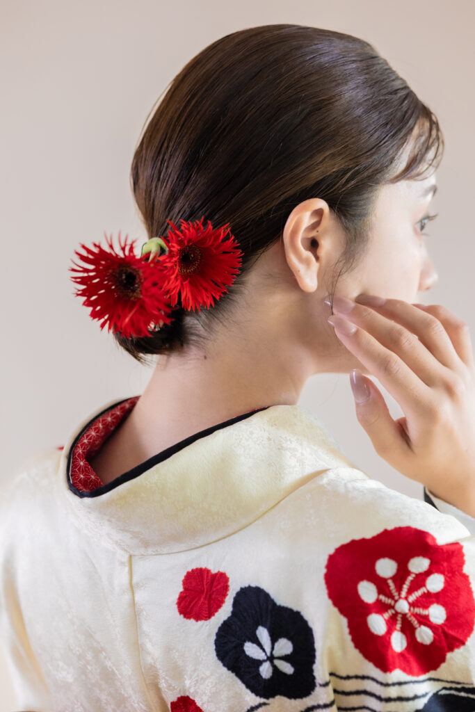 胸元から肩にかけての絞り染めの梅の花がお顔に映えます
