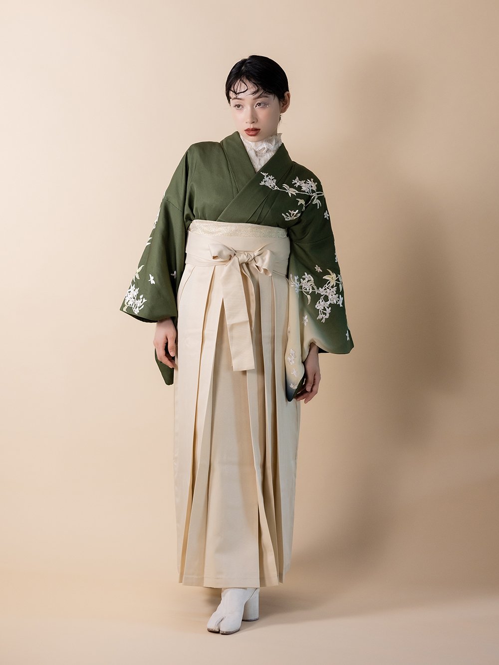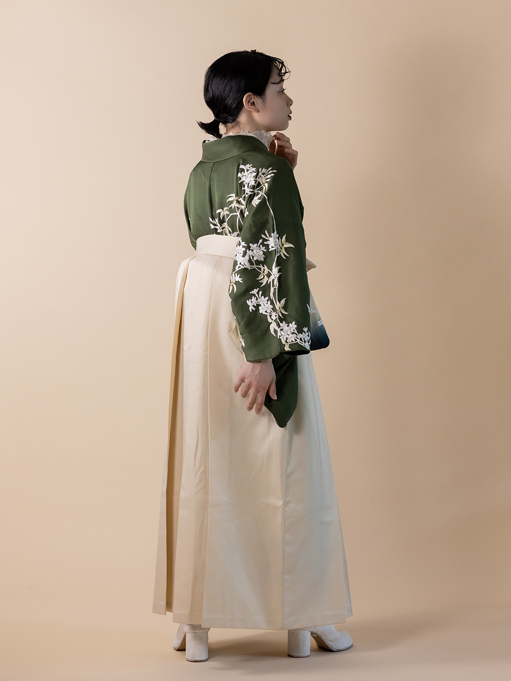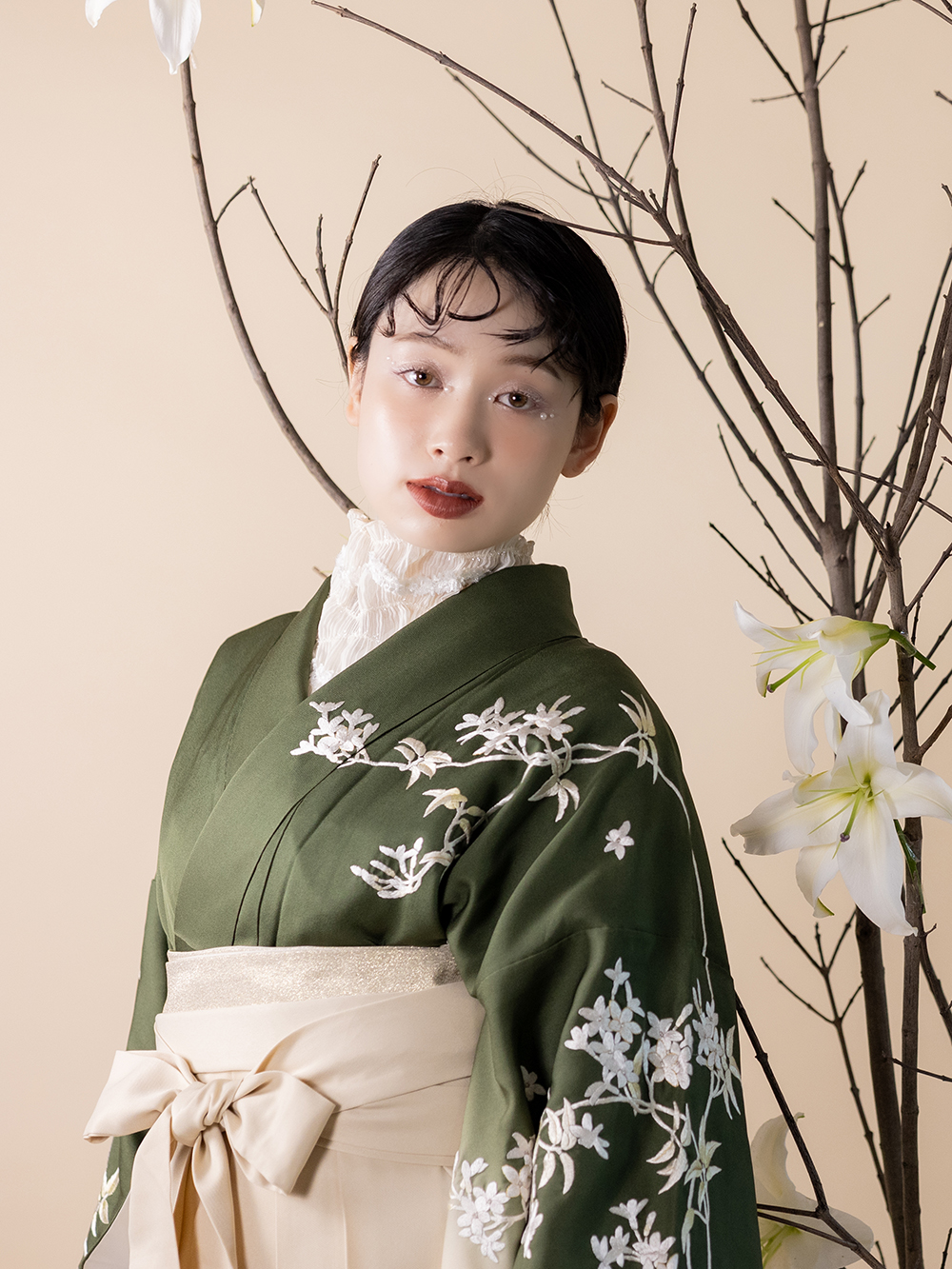 【着物】深緑裾藍色茉莉花【袴】生成無地 女子着付けパックの料金です 女子着付けパックに含まれるもの 着物・はかま・長襦袢・半幅帯・重ね衿・草履・着付け用小物セット・当日の着付け・ヘアセット  *刺繍衿と帯飾りは料金に含まれません