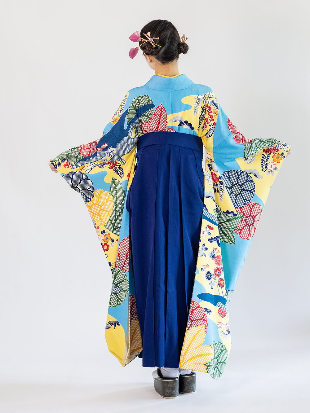 【着物】水色紅型牡丹に菊【袴】紺 女子着付けパックの料金です 女子着付けパックに含まれるもの 着物・はかま・長襦袢・半幅帯・重ね衿・草履・着付け用小物セット・当日の着付け・ヘアセット  *刺繍衿と帯飾りは料金に含まれません